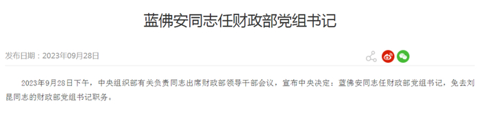 2023年9月28日下午,中央组织部有关负责同志出席财政部领导干部会议,宣布中央决定:蓝佛安同志任财政部党组书记,免去刘昆同志的财政部党组书记职务。