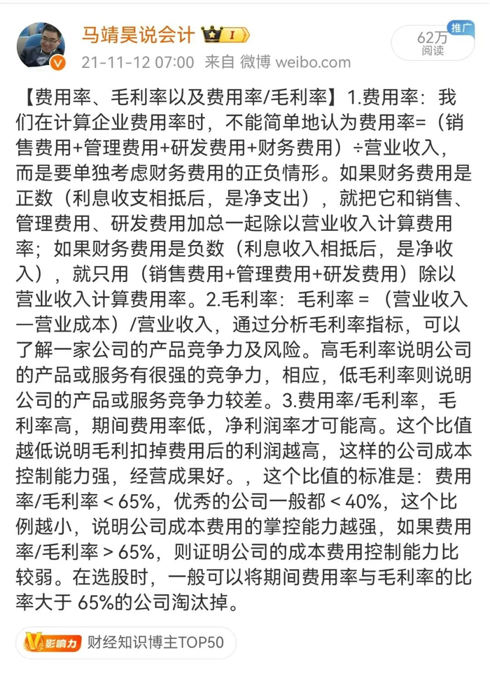 一般来说,可以将费用率/毛利率大于65%的公司视为成本控制能力较弱的公司,并考虑将其从投资候选名单中剔除。