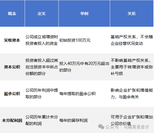 实收资本、资本公积、盈余公积和未分配利润是公司财务报表中的关键项目,它们各自具有不同的含义和用途,同时也存在一定的关系。下面我将通俗地解释这四个概念,并提供简单的例子。