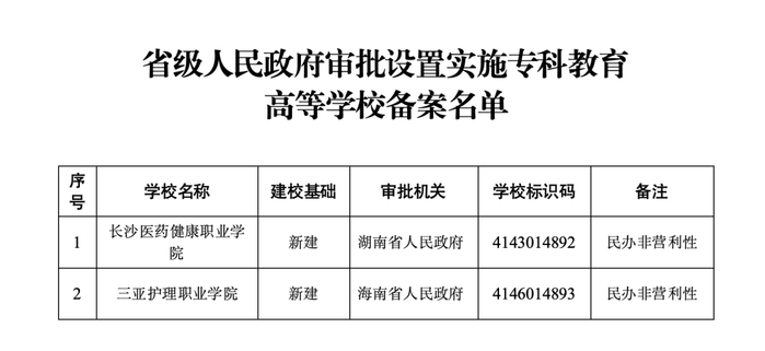 8月2日,教育部网站发布《2024年度第四批实施专科教育高等学校备案名单》。湖南和海南将分别新建长沙医药健康职业学院、三亚护理职业学院两所院校,均为民办非营利性性质。