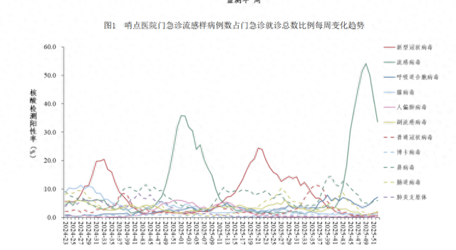 哨点医院门急诊流感样病例数占门急诊就诊总数比例每周变化趋势,图据中国疾控中心。