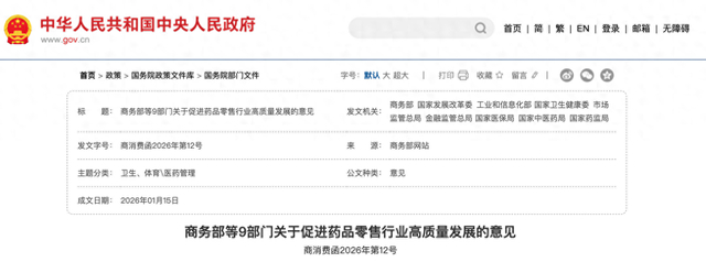 (人民日报健康客户端记者 刘静怡)1月22日,商务部等9部门联合印发《关于促进药品零售行业高质量发展的意见》。这是我国首个专门针对药品零售行业的政策文件,零售药店将成为居民健康管理的驿站。(https://www.gov.cn/zhengce/zhengceku/202601/content_7055835.htm)