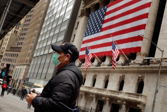 2020年3月17日,一名男子戴着口罩,以防暴露于冠状病毒疾病(COVID-19),这时他要经过纽约的纽约证券交易