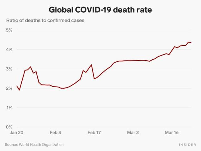根据约翰·霍普金斯大学的数据,截至上周五,全球冠状病毒死亡率徘徊在4.6%左右,高于世界卫生组织3月3日估计的约3.4%。