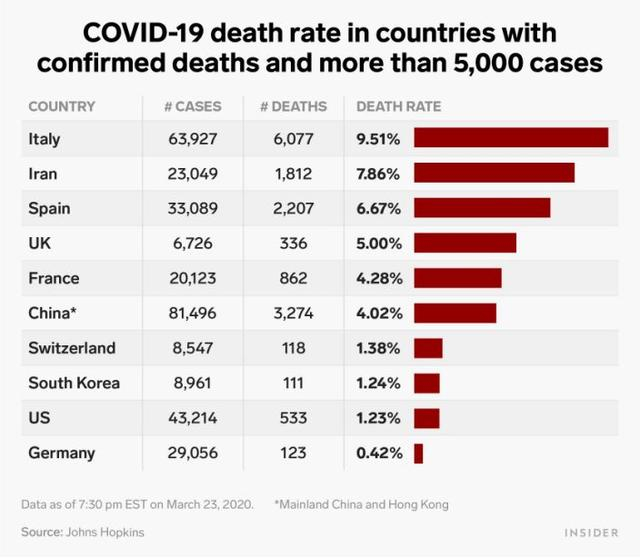 该冠状病毒死亡率-计算划分称为死亡人数确诊病例总数的数-广受国家现在有所不同。截至周五,美国的死亡率约为1.6%,而意大利的死亡率为10.6%,中国为4%。目前全球死亡率约为4.6%。下表比较了10个已确认死亡的国家和9,000多个病例的死亡率。