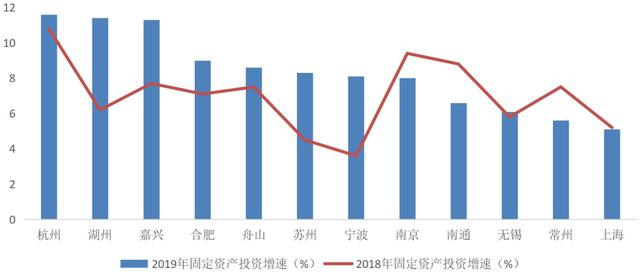 相比2018年,总体来看长三角地区的固定资产投资增速提升,但是内部存在明显分化。具体来看,12市中除南京、南通、常州、上海之外,其余8市均实现固定资产投资增速正增长。其中,湖州、宁波、苏州和嘉兴增速提升较为突出,分别提升了5.2、4.5、3.8和3.6个百分点。南通、常州和南京增速下降较多,分别下降了2.2、1.9和1.4个百分点。