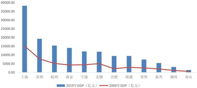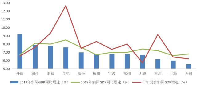分城市看,上海一枝独秀,2019年GDP总量达到3.82万亿元,远高于各地级市,其他城市可以分为三个梯队。苏州、杭州、南京为一个梯队,均超过1.4万亿元,这一梯队最高的是苏州,达到1.92万亿元。宁波、无锡、合肥、南通均在万亿左右,为一个梯队;而常州、嘉兴、湖州、舟山距离万亿有一定距离,为最后一个梯队,其中湖州和舟山差距较大,均低于4000亿元,上海GDP是舟山的27.82倍。相比2009年,12城中GDP总量提升最多的是上海,增量超过了两万亿元,提升最少的是舟山,增量规模不足千亿元。 从增长倍数来看,2009年到2019年,增长倍数最高的是合肥,高达3.48倍,最低的是无锡,增长倍数为1.37倍,其他城市增长倍数均处于1.4到2.4之间,整体而言,12城均实现了翻倍增长。进一步分析十年复合增速发现,合肥的十年复合增速最高,无锡的复合增速最低。
