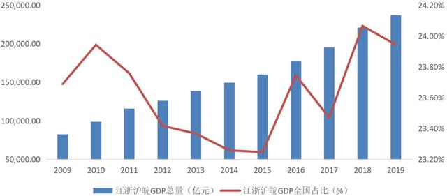 图1:2009年-2019年江浙沪皖GDP规模和占比变化(亿元,%)