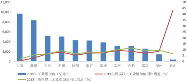 从增速来看,2019年长三角12市的规模以上工业增加值均实现了正增长,其中,因石化重大项目投产因素,舟山表现亮眼,同比增速远超其余11市,达43.2%;常州、合肥、湖州等其他9个城市的规模以上工业增加值同比增速均处于5%-10%区间;苏州和上海的规模以上工业增加值同比增速最低,均不足3%,上海仅1.9%。