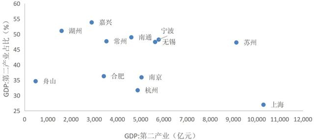 就第二产业规模而言,上海、苏州明显领先其他城市,截止2019年底,这两个城市的第二产业规模分别为10299.16亿元和9130.18亿元,远高于第三位宁波(5782.90亿元),规模优势明显。第二梯队的有宁波、无锡、南京、杭州、南通,常州,合肥,第二产业规模在3000亿元至6000亿元之间。而浙江省的舟山、湖州、嘉兴三市排位最末,规模不足3000亿元,其中舟山最小,第二产业规模仅476亿元。