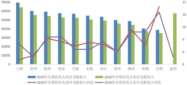 从人均可支配收入来看,上海和苏州具有领先优势,2019年人均可支配收入均超过6万;杭州、南京、宁波、无锡和舟山紧随其后,人均可支配收入在5.3 - 6万区间;而常州、湖州、南通和合肥的人均可支配收入均低于5万,其中合肥最低,仅3.88万。从增速来看,除嘉兴外的其他11市中合肥的人均可支配收入提升明显,2019年人均可支配收入同比增速超过10%,其他城市增速大致在8%到9%之间,也实现了稳定增长。从增速的变化来看,与2018年相比,2019年无锡、合肥、宁波、湖州、苏州、常州的人均可支配收入增速有所提升,其中无锡和合肥增速提升较快,分别增加了0.28个和0.22个百分点;而上海、南通、南京、舟山、杭州的人均可支配收入增速较2018年有所下降,上海下降最快,下降了0.61个百分点。