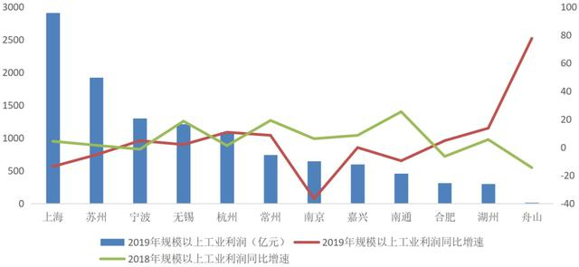 ■ 沪苏规模和利润均领先,工业利润增速升降各半。上海和苏州工业增加值均超过8000亿元,远超排名第三的宁波(5165亿元),工业利润分别2906.25亿元和1922.23亿元,也远超其他城市;2019年12市工业增加值均实现正增长,但是整体增速比上年收窄。工业利润增速提升和下降的城市各半,提升最多的是合肥,提升了11.2个百分点,降幅最大的是南京,下降了42.7个百分点。