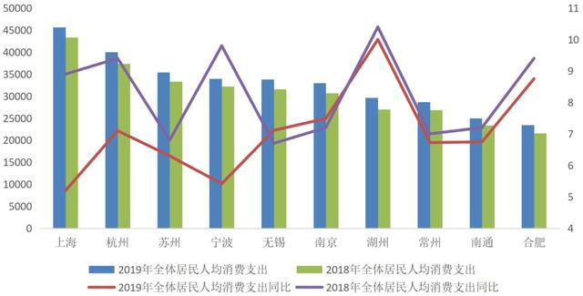 从人均消费支出来看,2019年上海和杭州人均消费支出均超过4万,苏州、宁波、无锡、南京紧随其后,人均消费支出均大于3万,湖州、常州、南通、合肥的人均消费水平较低,人均消费支出不足3万,其中,合肥最低,仅2.34万。从增速来看,相较于可支配收入,除湖州、合肥外,其他城市消费增速较低。人均消费支出增速的变化情况也表现了这一趋势:相比2018年,2019年除南京、无锡外其他8市的人均消费支出同比增速均有所下降,其中宁波和上海下降幅度最大,分别下降了4.38和3.70个百分点。