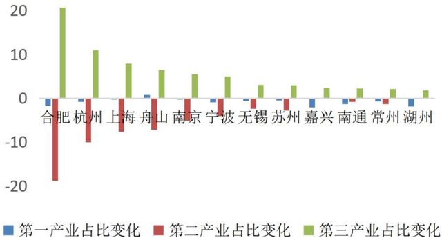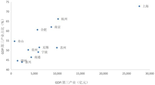 再看第三产业,不论是规模还是占比,上海均一枝独秀。南京、杭州、合肥三大省会城市的第三产业占比均超过60%,是产业转型的领头羊。舟山的第三产业发展迅速,第三产业占比超过全国平均水平,而其他7市的第三产业占比均低于全国平均水平。