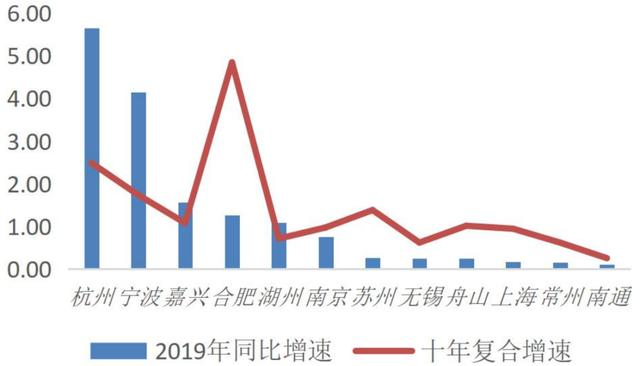 2019年,12市固定资产投资增速均为正值,固定资产投资保持增长态势。分城市来看,固定资产投资增速呈现阶梯式分布特征。其中,杭州、湖州、嘉兴为第一梯队,固定资产投资增速均超过10%;合肥、舟山、苏州、南京为第二梯队,增速在8-9%之间;南通、无锡、常州、上海为第三梯队,增速较低,在5-7%之间。