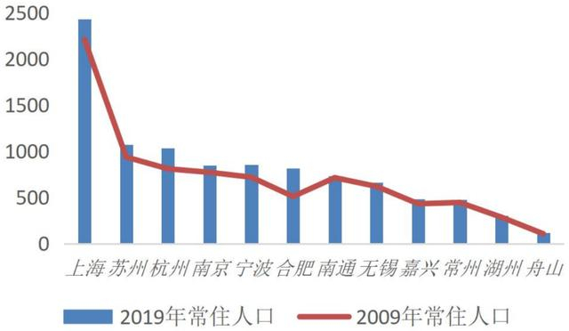 从增速来看,2019年长三角12市人口均实现正增长,整体增长态势与省份人口增长态势一致,呈现浙江>安徽>江苏>上海的整体格局。其中浙江的杭州和宁波增长迅速,涨幅分别达到5.65%和4.15%,而江苏各市除南京外,人口增长趋缓,增速均低于0.3%,这或与浙江更为活跃的经济环境相关。而十年复合增速则是合肥增长较快,这也与合肥省会地位进一步提升,城市加速转型发展相符合。