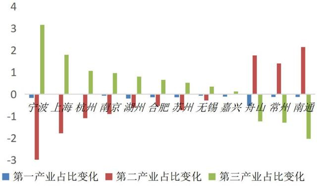 2019年,有9个城市的产业结构为“三二一”结构,仅有南通、嘉兴、湖州呈现“二三一”结构,其中上海和杭州第三产业占比最高,分别为72.74%和66.17%。对比2018年,多数城市第三产业占比提升,其中宁波提升最快,提升了3.16个百分点,而南通、舟山和常州第二产业占比提升,其中南通提升最多,为2.15个百分点。由此可见,短期内南通仍主要依靠第二产业实现自身发展。观察近5年变化,12个城市的三产占比均有明显提升,提升最快的是合肥,提升超过20个百分点,主导产业由第二产业转型为第三产业;杭州的第三产业占比提升排名第2,提升了10.97个百分点。