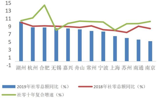 从增速看, 2019年,湖州消费表现突出,是同比增速唯一达到10%的城市;杭州、合肥、无锡、嘉兴、舟山、常州、宁波七城的社零总额同比增速在8%左右;而上海、苏州、南通、南京的同比增速较低,均不超过6.5%。从十年复合增速来看,合肥社会消费品零售总额十年复合增速最高,达到16.48%,杭州排第二(13.16%),上海和无锡复合增速最低,分别为9.98%和9.95%,其他城市复合增速均超过10%。从增速变化来看,12市社会消费品零售总额增速呈放缓态势。与2018年相比,2019年12市中仅有湖州实现了增速的小幅提升,其他城市同比增速均呈现不同程度的下降,其中南通和南京降幅最大,分别下降了3.4和3.2个百分点。而与十年复合增速相比,增速收窄趋势更为明显,降幅最小的无锡下降1.5个百分点,十年复合增速最高的合肥下降7.8个百分点,多数城市下降2到5个百分点。