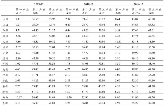 2019年,长三角地区三大产业结构为3.97:40.66:55.37,是明显的“三二一”产业结构,与全国的三产结构(7.11 :38.97:53.92)相比,第二产业和第三产业占比均高于全国。分省来看,江浙沪第三产业占比均高于全国,第一产业明显低于全国;安徽产业结构与全国相近,相比2014年,第三产业占比提升显著。