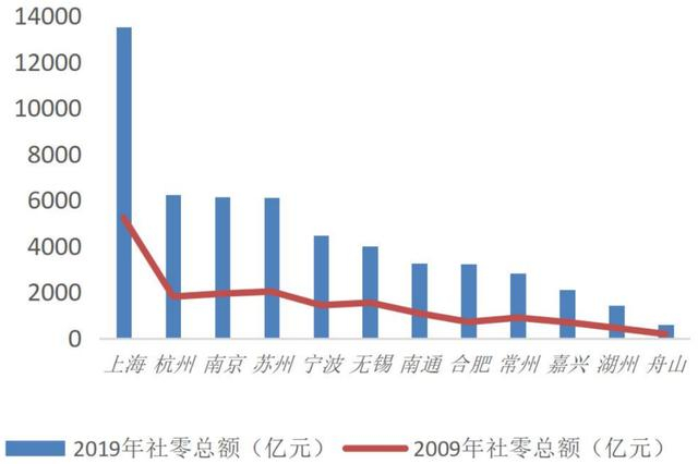 整体来看,长三角12市的社会消费品零售总额持续提升,但差距明显,2019年数据显示,上海社会消费品零售总额最高,达到13497亿元,是第二位杭州的2倍。杭州、南京、苏州社会消费品零售总额超过6000亿元。其他城市均低于4500亿元,其中湖州和舟山最低,分别为1429亿元和581亿元,最高的上海是最低的舟山的23倍。与2009年相比,上海的社会消费品零售总额增量最高,超过8000亿,第二梯队的杭州、南京和苏州增量超4000亿。从增长倍数来看,合肥社会消费品零售总额的增长倍数最高,达到3.6倍,杭州、南京、苏州、宁波、南通、常州、嘉兴、湖州和舟山的增长倍数介于2-2.5倍之间,而上海和无锡的增长倍数最低,分别为1.59倍和1.58倍。