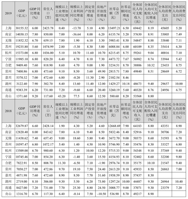 值得注意的是, 近两年大部分城市GDP增速有所放缓,与2018年相比,2019年苏州和南通的GDP增速下降较多,均超过1个百分点,而舟山、杭州增速超过2018年,其中舟山提升了2.5个百分点。
