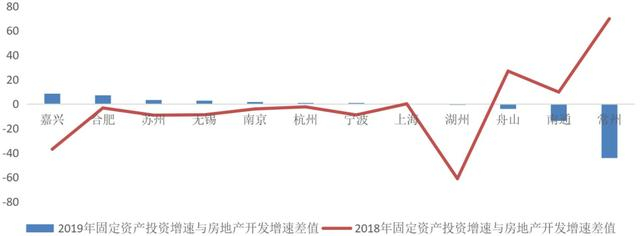 相比2018年,有10市增速差值出现反转。其中,嘉兴、合肥、苏州、无锡、南京、宁波由负向差值转为正向差值,说明这些地区的固定资产投资相较于房地产开发投资增长更快;而舟山、南通、常州则由正向差值转为负向差值,说明这些地区的房地产开发投资增长迅速。
