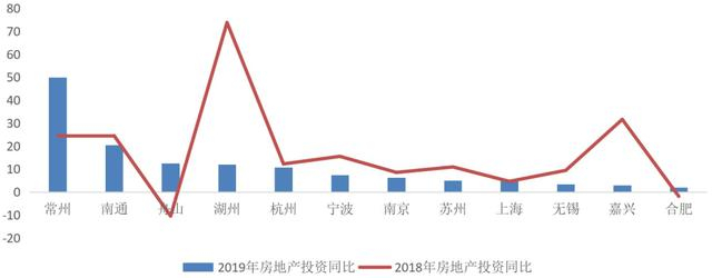对比2018年,除常州、舟山、上海、合肥外,其余8市的房地产开发投资增速较2018年均有所下降。其中,湖州、嘉兴降幅明显,分别下降了61.8和28.7个百分点。