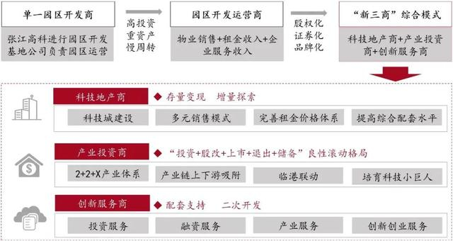 一是不断拓宽存量园区的服务业务范围,提升专业化能力。部分全国领先的国家级开发区平台公司转型步伐较快。其中,张江高科的战略转型案例受到了广泛关注。其发展路径由以工业地产为主导的“高投资、重资产、慢周转”模式,向“股权化、证券化、品牌化”转型升级,提出了以“科技投行”作为战略发展方向,着力打造新型产业地产营运商、面向未来高科技产业整合商和科技金融集成服务商的“新三商”战略。