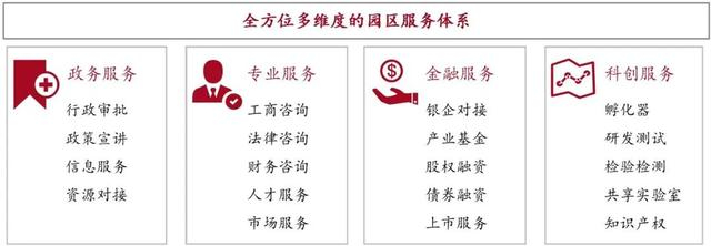 (2)专业服务领域更广、服务质量更高:围绕企业和人才需求,园区搭建综合性的专业服务平台,为企业提供财税、法律、工商咨询、人力资源、市场营销等企业经营管理的相关服务。为了提高服务的专业性,通常会引入第三方专业服务机构来提供上述支撑性服务。