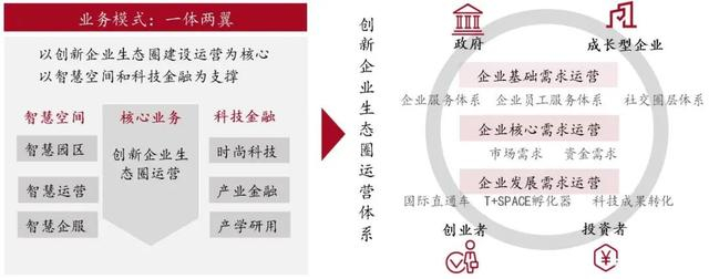 高品质的园区环境和优质的产业服务是产业地产商得以脱颖而出的两大关键抓手。这些产业地产商在判断城市区位选择、产品开发设计与建设等方面具备经验优势,同时,市场化的基因决定了他们在服务园区企业时能够比政府“更接地气”,比较善于打造产业综合体、产业小镇等产城融合型园区以及功能业态混合的小型科技园。以天安数码城为例,经过30多年的发展,公司提出以创新企业生态圈建设运营为核心、以智慧空间和科技金融为支撑的“一体两翼”的业务模式,为成长型企业提供集产业链融合、生产性服务、商务生活设施和创新文化为一体的综合服务。