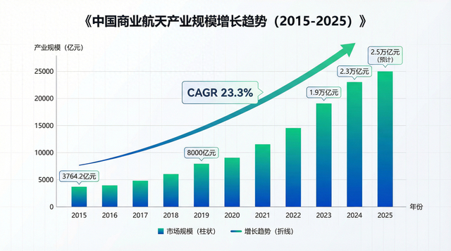 更值得注意的是增长速度。如果你去计算一下2019年到2023年的年复合增长率(CAGR),你会发现这个数字高达23.3%。在当前的宏观经济环境下,能保持20%以上复合增速的万亿级赛道,真的是凤毛麟角。按照这个速度推算,2025年中国航天产业规模有望达到2.5万亿元。这不仅仅是一个数字的跳动,更是整个产业链上下游数千家企业共同创造的实打实的产值。