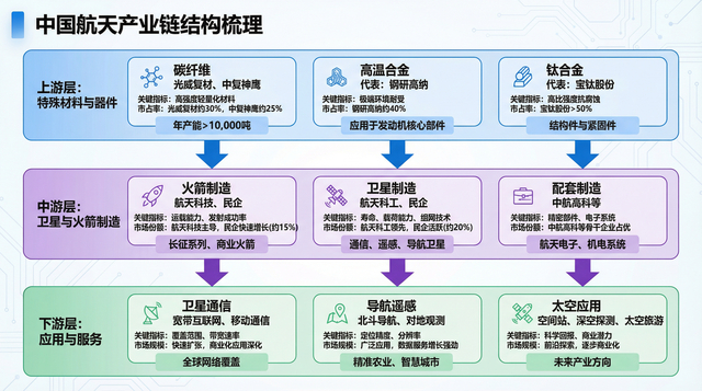 很多人觉得航天产业高不可攀,其实如果我们把它拆解开来,逻辑非常清晰。这就好比当年修铁路,有人造铁轨,有人造火车,有人负责运营卖票。航天产业的链条虽然长,但核心就分三段:上游制造材料与器件,中游制造卫星与火箭,下游搞应用服务