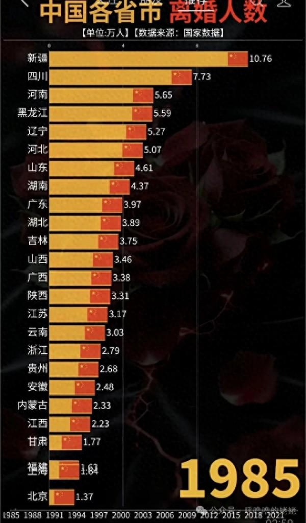 我刚处理完几份乏味的投研报告,揉眼间,屏幕上划过几张略显粗糙的统计图。那是关于“中国各省市离婚人数”的历年轨迹。从1985年到2024年,整整四十年的光阴,被浓缩成几根不断攀升的色条。
