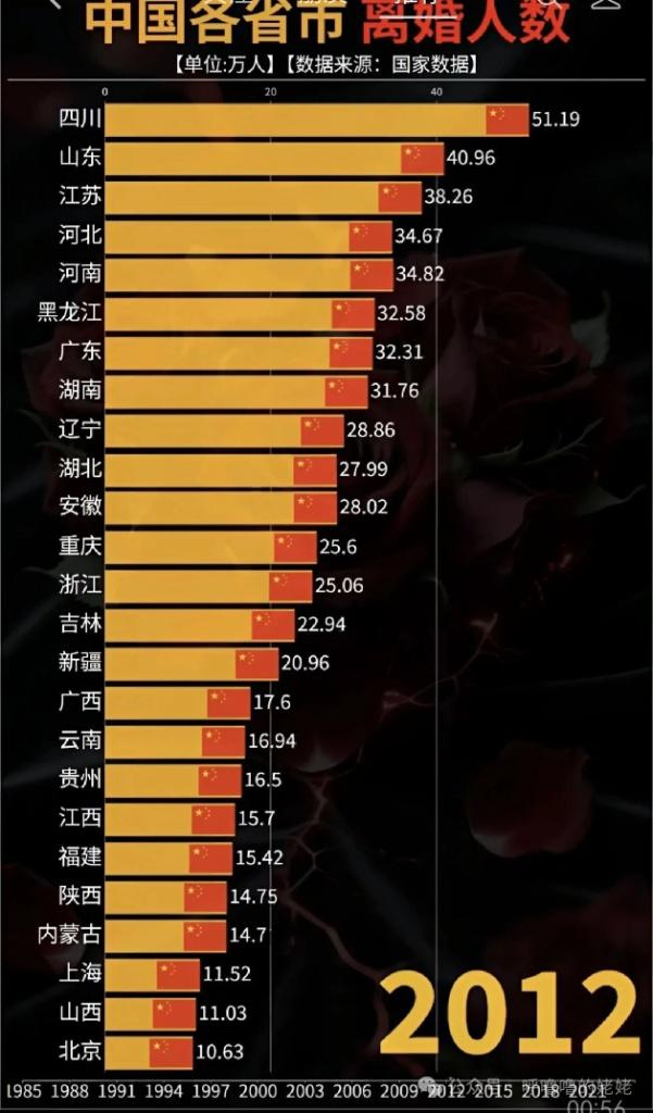 - 广东的崛起:2024年广东离婚人数飙升至48.32万。这并非广东人不再相信爱情,而是作为外来人口流入的大省,高强度的竞争压力与原子化的社会关系,正在加速家庭这一社会最小单元的解体。