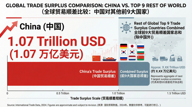 2025年前11个月,中国贸易顺差超1万亿美元。这个数字已超全球其他九大顺差国家的总和。用一句话说,中国一国的贸易成绩单击败了整个西方工业阵营加起来的努力。
