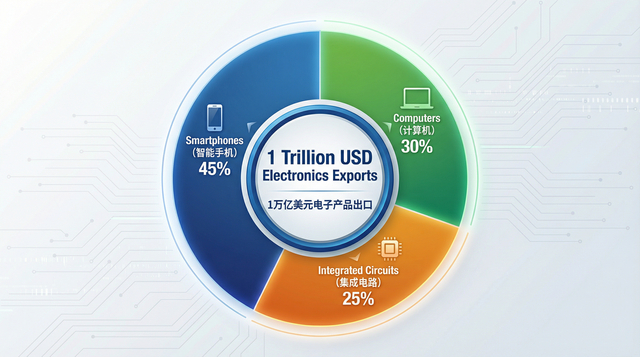 全球电子产品出口,中国占压倒性份额。手机、平板、笔记本,每品类中国都是最大生产国。苹果、三星也依赖中国代工和零部件。