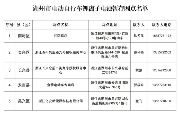 为进一步做好电动自行车锂离子电池回收服务工作,方便回收途径,现公开电动自行车锂离子电池暂存网点名单。辖区内群众可根据实际需求,就近选择暂存网点暂存锂离子电池。网点名单如下: