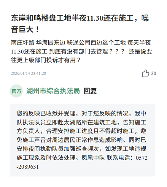 对此,湖州市综合执法局回复:对于您反映的情况,我中队执法队员立即赴太湖路所在建筑工地,告知施工方负责人,合理安排施工进度且不得超时施工,避免施工声音对周边居民正常作息造成影响。同时已安排夜间执勤队员加强巡查频次,如发现工地违规施工现象及时依法处理。