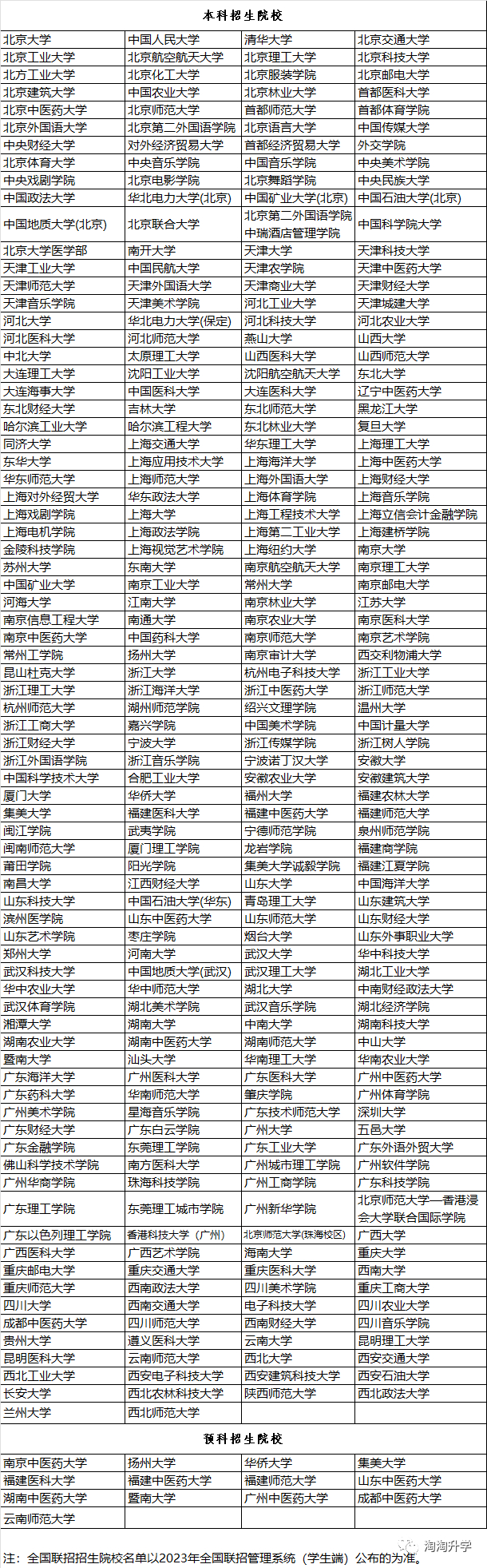 2023年全国联招招生院校共319所,其中本科招生院校306所,预科招生院校13所,几乎覆盖了所有类型的高校,C9高校、985高校、211高校、重点大学、二本院校、三本院校各类高校都有。具体名单如下: