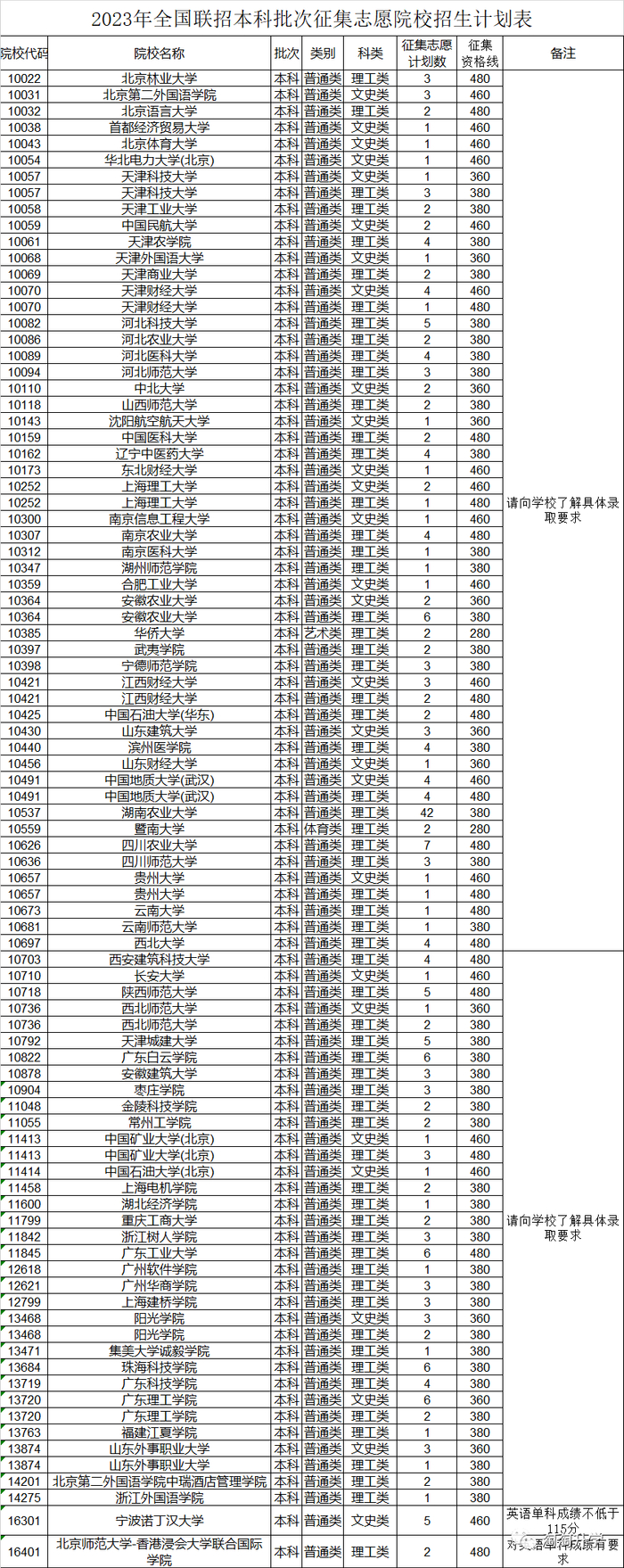 部分院校执行高分线,文史类:460分,理工类:480分,高分线院校名单详见全国联招管理系统。