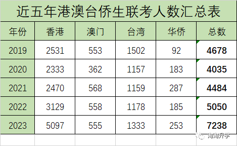 2023年华侨生联考总报考人数为7238人,其中,中国香港籍5097人,中国澳门籍555人、中国台湾籍1333人、华侨生253人,主力军还是港籍生。近五年报考人数如下: