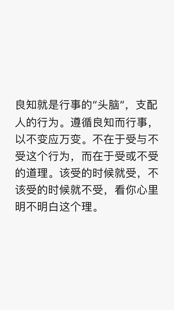 21、固是事事要如此,须是识得个头脑乃可。义即是良知,晓得良知是个头脑,方无执着。且如受人馈送,也有今日当受的,他日不当受的。也有今日不当受的,他日当受的。你若执着了今日当受的,便一切受去。执着了今日不当受的,便一切不受去。便是适莫。便不是良知的本体。如何唤得做义?