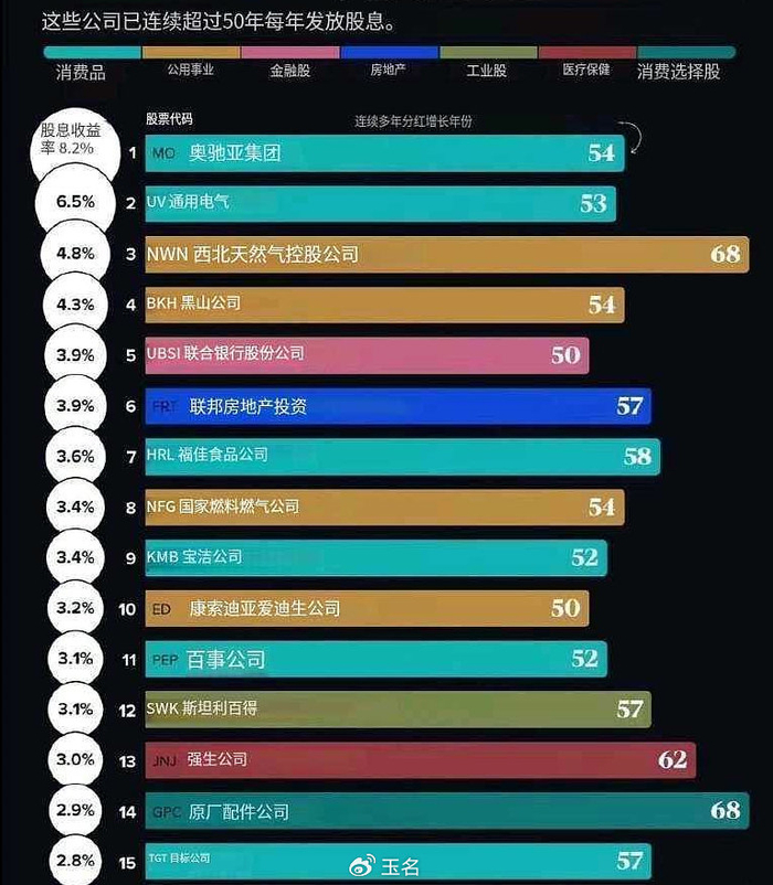 市场中那些另类:自1890年成立以来,宝洁一直连续133年支付股息。自1956年以来,连续67年增加了股息。在过去的十年中,股息以每年平均5%增长。The York Water 更牛,连续支付208年的股息了。而类似50年连续派发的股息公司就是一群了,当然派发股息是大股东获益最大,但这也说明公司持续向好,大股东只要搞好公司拿股息就很舒服了,和广大持股者利益一致。