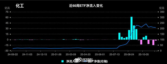 四季度有过化工大热,而我们注意到在今年7-8月份的时候,化工类ETF有过一段时间持续流入,当时从20亿元一路超过百亿元,如今11月份,已经接近250亿元,扩张还是很快的。不过大家也看到了,从7-9月,尽管流入,但板块涨幅不大,这期间指数倒是新高不断,落后于指数,因此如果不是对板块有研究的,根本不可能拿得住,也就不可能有10-11月份的反弹。