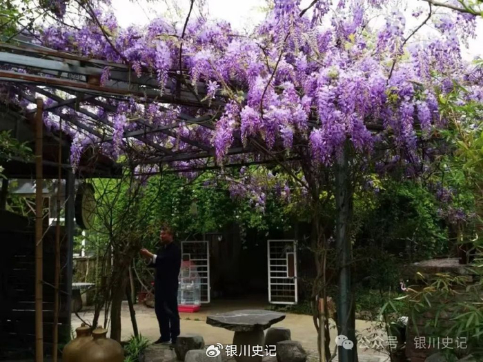 三安居对面是三株紫藤,紫色的花海绽放在头顶,藤蔓垂下,宛如天然的凉棚。下面一个四人份的石桌和石凳,紫藤花下,品茗对弈,时光悠然。