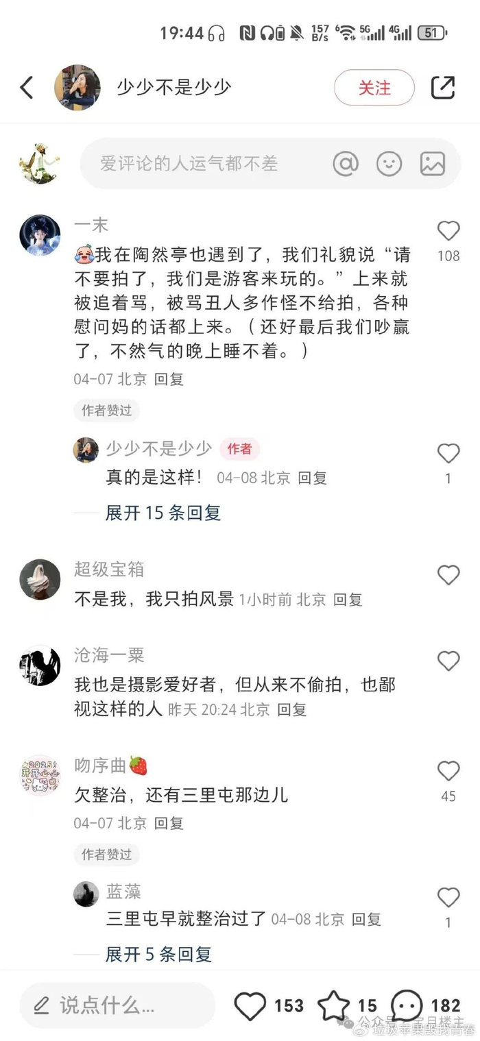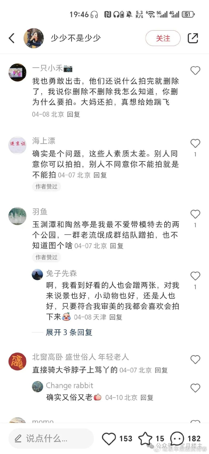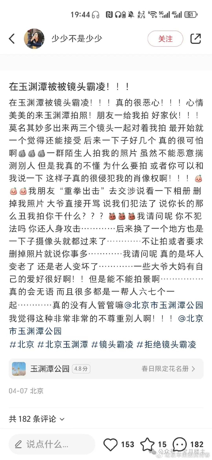 嘿!您瞅小红书上有个爱拍照的姑娘,ID 叫 “少少不是少少”,爆了篇帖子叫《在玉渊潭被镜头欺负!!!》。要我说啊,这事就得掰开揉碎了讲 —— 那帮举着相机的老流氓,合着把公园当自家摄影棚了?镜头怼人脸上拍还理直气壮,真是越活越回去了!