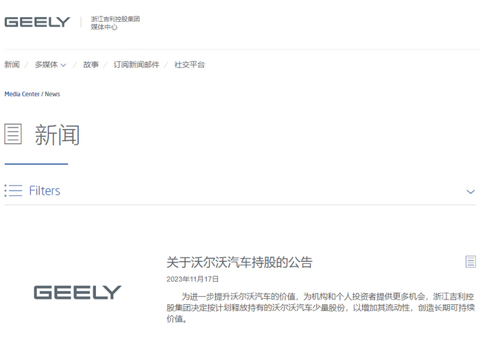 11月17日,吉利控股集团发布减持沃尔沃汽车公告称,将出售约1亿股沃尔沃汽车的股票,减持比例为3.3%。此次出售股份占沃尔沃汽车已发行股本的3.4%,占吉利对沃尔沃持股的4.1%,吉利控股持有的沃尔沃汽车股份由82%降至78.7%。