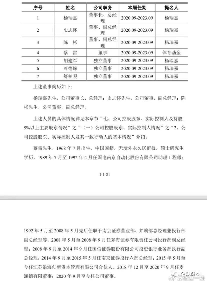 值得注意的是,在杨瑞嘉和史志怀掌控的麦澜德董事会中,有一位董事蔡雷,其身份较为特殊。据披露,蔡雷通过麦澜德第七大股东体育基金间接持有公司0.0067%的股份。蔡雷曾在南京证券工作近17年,担任过营业部、并购部总经理及投行部副总经理等职,2014年至2015年还担任南京证券投行六部总经理。而南京证券正是麦澜德此次IPO的保荐机构和主承销商,这意味着麦澜德的董事之一出身于其保荐机构,且资历颇深。