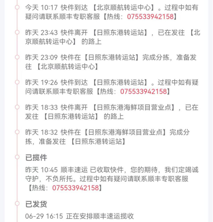 快递信息显示,货物是从山东日照发往北京,且是通过顺丰速运进行运输