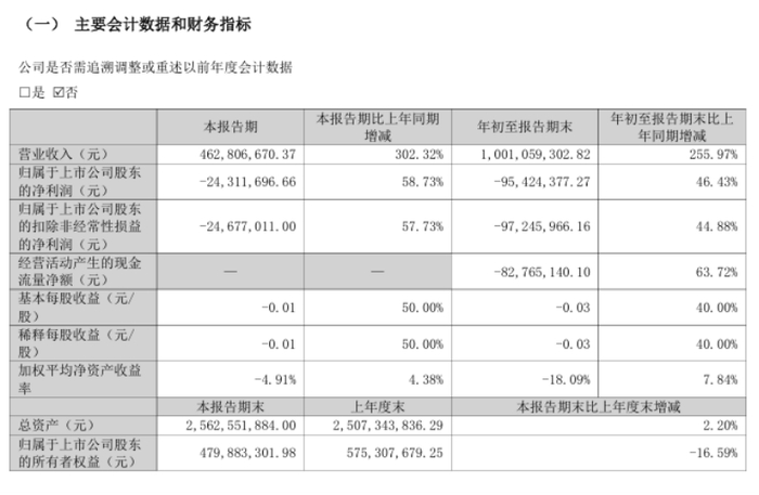 公司营业总收入为10.01亿元,较2024年同报告期营业总收入增加7.20亿元,同比较2024年同期上涨255.97%。归母净利润为-9542.44万元,较2024年同报告期归母净利润增加8270.88万元,实现2年连续上涨。经营活动现金净流入为-8276.51万元,较2024年同报告期经营活动现金净流入增加1.45亿元。